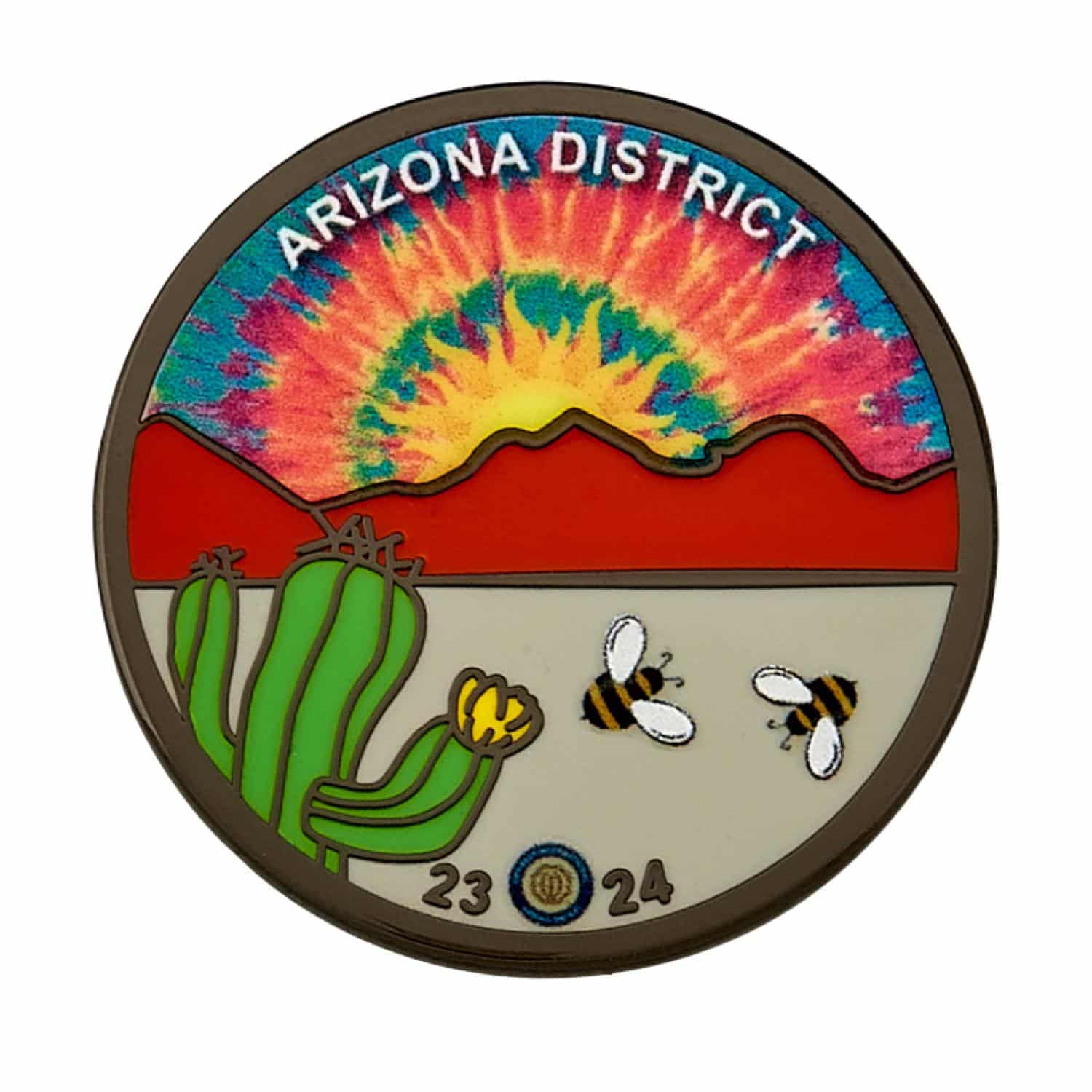 Hard enamel base with a full color gradient UV print design! A better quality option than photo print! No cheap poly dome! Nice and thick like traditional die struck pins but with gradients and small colored details. All of the quality of a hard enamel pin with all the design flexibility of UV printing. Other sizes available, please call for pricing. Custom shape, up to 4 enamel colors and butterfly clutch or rubber clutch backing. 1″ W