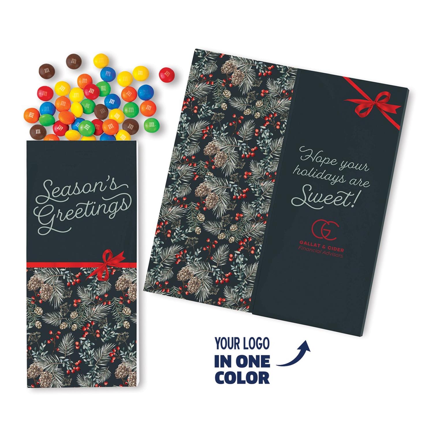A Sweeter Card is a greeting card and gourmet treat in one. This gift features your logo foil-stamped in one color of your choice on the inside. The pre-designed card features a traditional pine boughs and berries design and comes packed with an array of colorful candy coated chocolate bitz. Choose the imprint color from the choices below and send us your logo. Complies with CPSIA, FDA, Prop 65. 7.75″ L x 3.5″ W x 0.5″ H